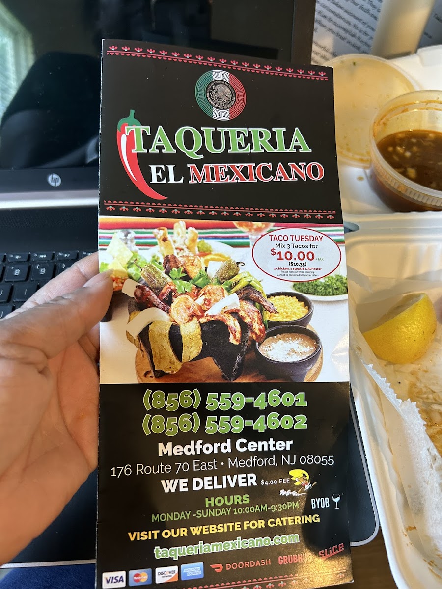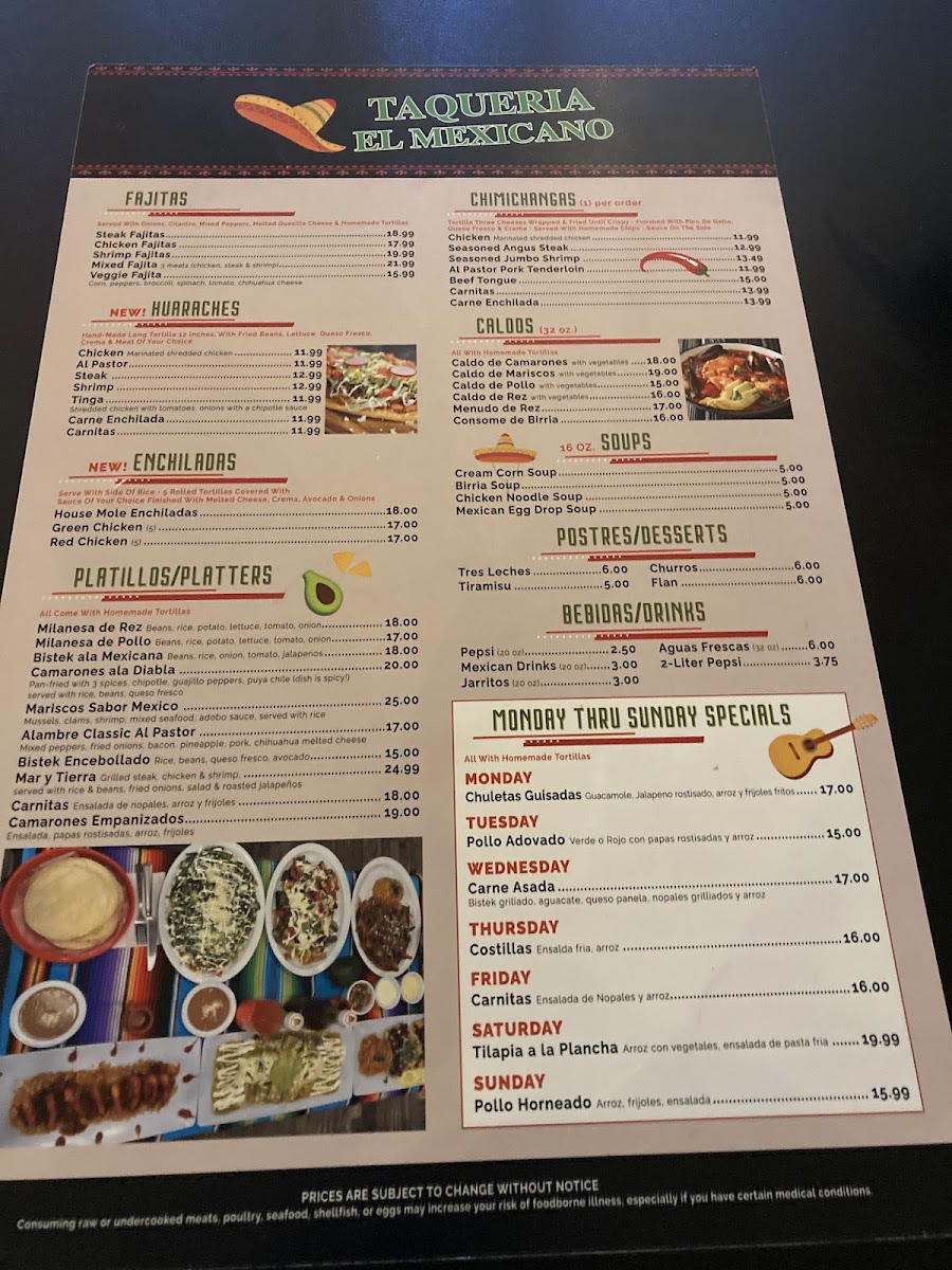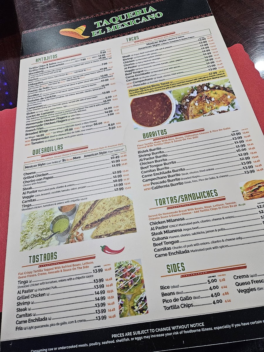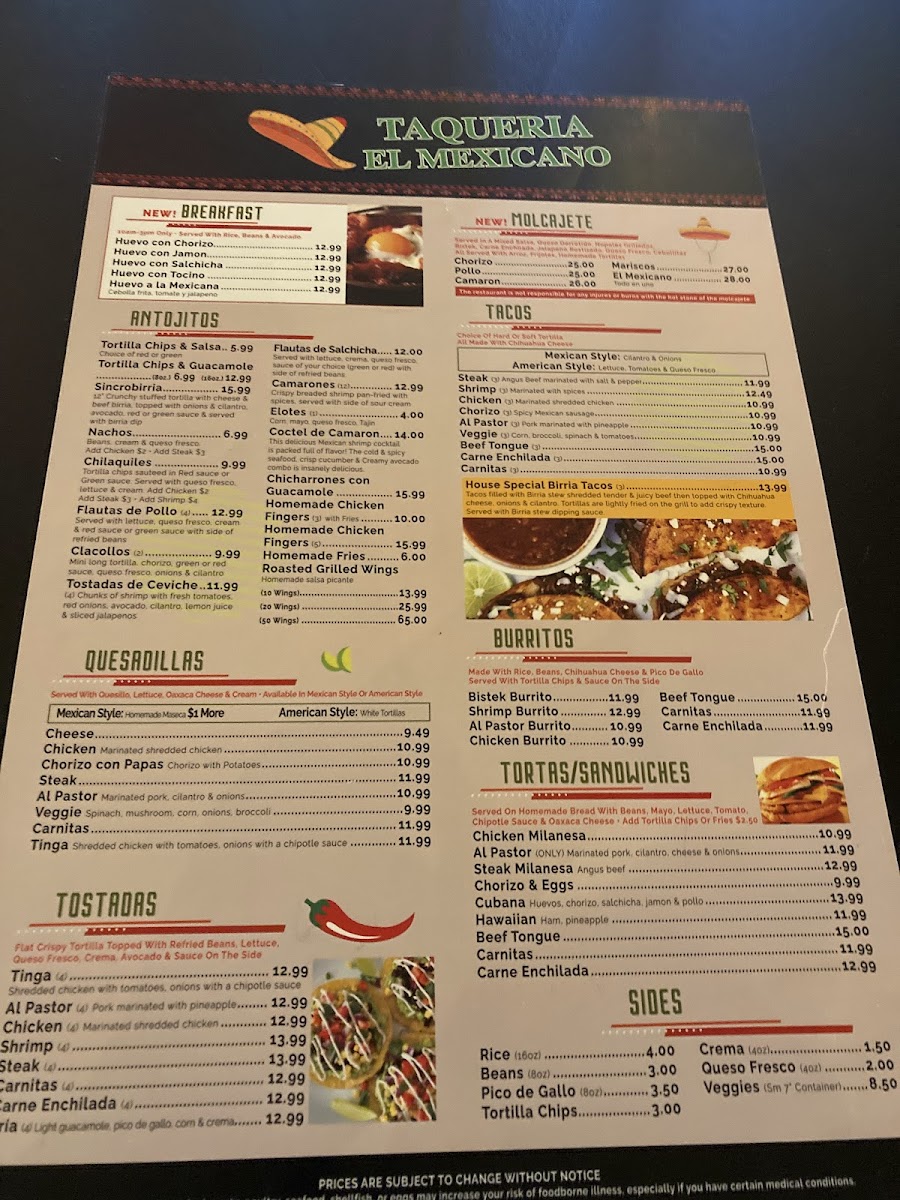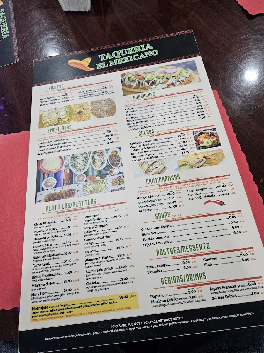 From a reviewer’s perspective, the menu at Taqueria El Mexicano is a vibrant celebration of classic Mexican flavors, offering a variety of options across appetizers, mains, and desserts. Starters like Tortilla Chips & Salsa and SincrobirriaNachos El Mexicano set the tone for a flavorful meal, while the taco selection, including Steak Taco, Shrimp Taco, Chicken Taco, and Al Pastor Taco, showcases both traditional and creative fillings. Quesadilla lovers will enjoy choices such as Cheese Quesadilla, Chorizo Con Papas Quesadilla, and Al Pastor Quesadilla, and burritos range from Bistek Burrito to Beef Tongue Burrito, each generously portioned. For heartier options, the chimichangas, like Grilled Chicken Chimichanga and Seasoned Jumbo Shrimp Chimichanga, are indulgent and satisfying, while the Tortas & Sandwiches selection, featuring Chicken Milanesa Torta and Cubana Torta, offers a handheld delight. Fajita fans can savor Steak Fajita, Mixed Fajita, or Veggie Fajita, and enchiladas, from Green Chicken Enchiladas to Enchiladas Divorciados, provide comforting, saucy options. The platters, including Chiles Relleno Platter and Bistek Ala Mexicana Platter, and huaraches, like Al Pastor Huaraches and Shrimp Huaraches, offer generous portions perfect for sharing. Molcajetes, soups, and caldos, such as Camaron Molcajete and Menudo De Rez, bring traditional depth, while sides like Rice, Beans, and Pico De Gallo complement any entrée. For dessert, offerings like Churros, Flan Napolitano, and Fried Cheesecake provide a sweet finish. The restaurant also accommodates beverages, from Jarritos to Aguas Frescas, and a kid-friendly menu featuring Mini Burrito and Chicken Nuggets. Overall, Taqueria El Mexicano delivers a comprehensive, authentic Mexican dining experience with a menu that balances traditional staples, inventive options, and catering versatility, making it a go-to destination for both casual meals and special occasions.
